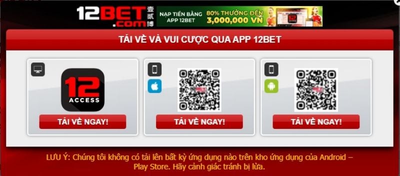 Sau khi truy cập vào 12Bet, bạn hãy click vào biểu tượng di động trên trang chủ để truy cập vào phần tải app, thực hiện tiếp: