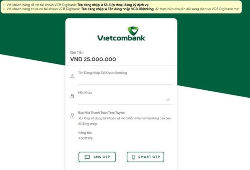 Bước 5: Một cửa sổ mới sẽ hiện ra với trang liên kết chuyển khoản của ngân hàng mà bạn đã chọn. Thực hiện đăng nhập và chuyển khoản theo hướng dẫn của ngân hàng tại trang này.