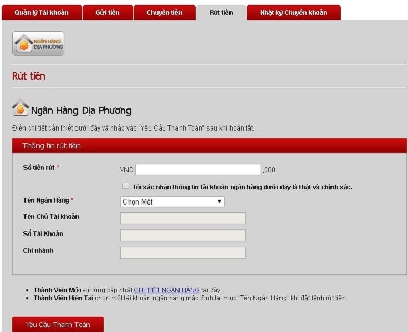 Bước 2: Chọn ngân hàng của bạn và điền số tiền bạn muốn rút (tối thiểu 200k), điền tiếp các thông tin tài khoản liên quan.