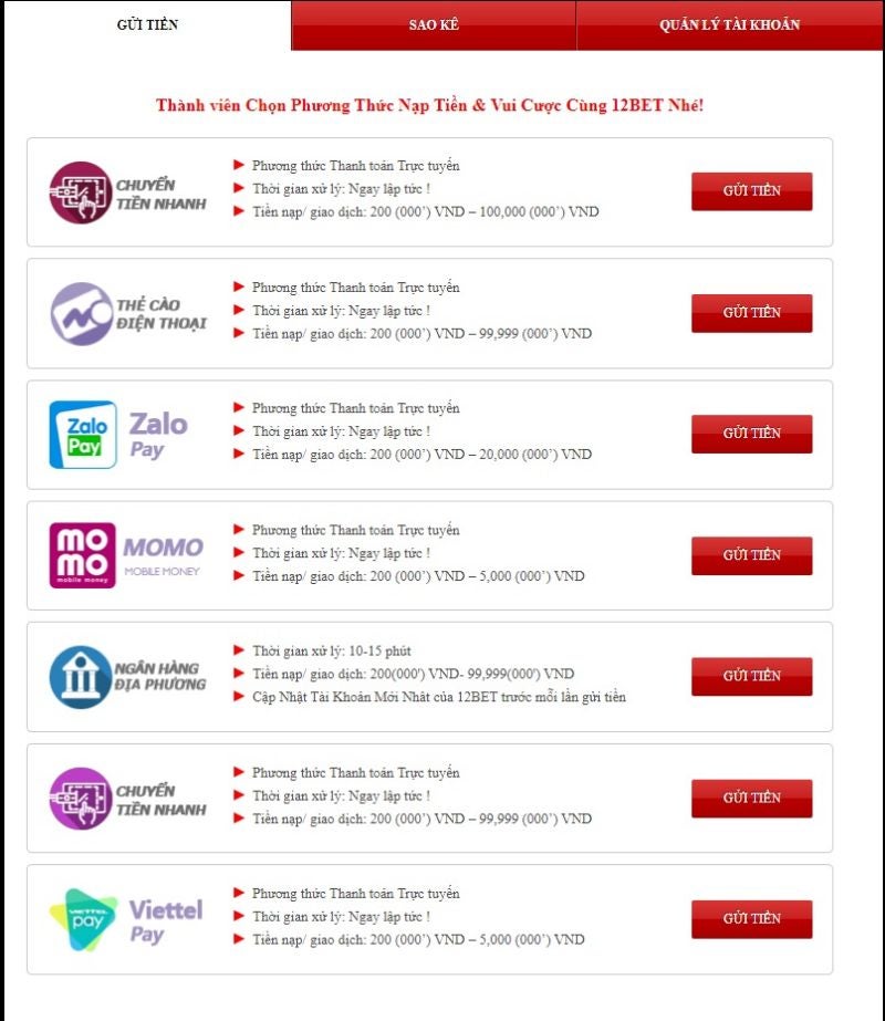 Rất nhiều phương thức nạp tiền được 12Bet hỗ trợ nhằm tạo điều kiện thuận lợi nhất cho mọi người chơi cá cược. Theo đó, nhà cái này có các phương thức sau: