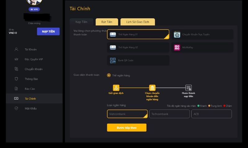 Bước 3: Chọn ngân hàng mà bạn muốn nạp. Click tiếp vào bước tiếp theo.