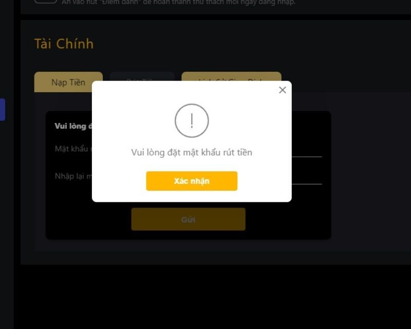 Bước 1: Cũng như giao dịch nạp tiền, bạn cần đăng nhập tài khoản chơi, click vào chữ Nạp tiền và sau đó ấn vào tab Rút tiền để thực hiện giao dịch. Nếu đây là lần đầu tiên rút tiền, bạn sẽ cần nhập mật khẩu rút tiền.